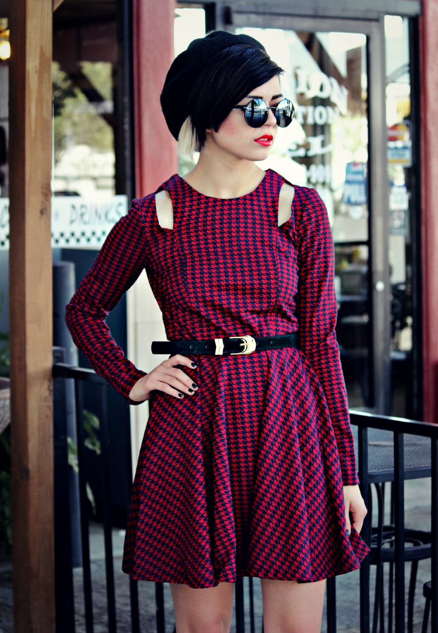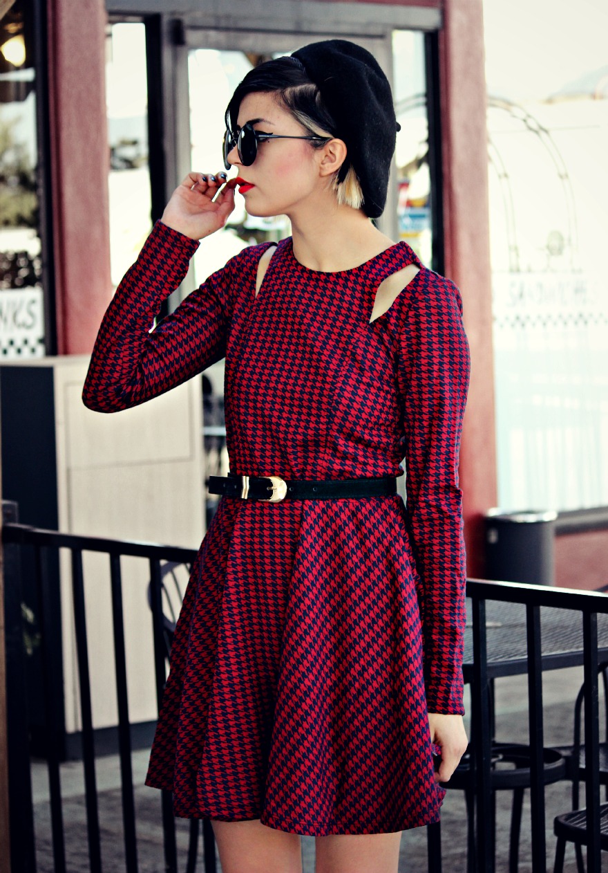 I just can’t stop wearing this cute little wool beret I bought in Chicago since cutting all of my hair off. It just gives me this frenchy, cute, sexy vibe to every outfit. Today I am wearing this totally kick-ass dress courtesy of Lucca Couture, as I am there ‘Blogger of the Month’. Woo! You all will be seeing me busting out tons of cute outfits from their fall collection they sent me. And, I really want to stress this, I am VERY impressed with the quality of the clothing. Everything I received feels high end and durable like it will last for years. Long enough to perhaps pass on to my future daughter! So, I really encourage you guys to all take a look at their new fall collection because it is has tons of really adorable & edgy pieces. This dress is one of my favorite pieces! It’s feminine and punk-ish. I also think it is neat that they made the dark houndstooth print a navy instead of black so that it keeps it a bit more light hearted.