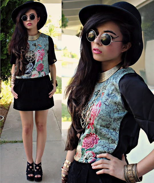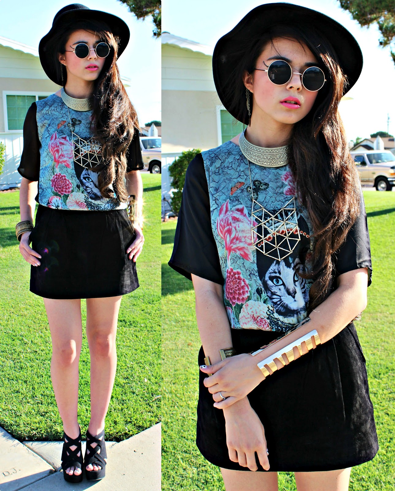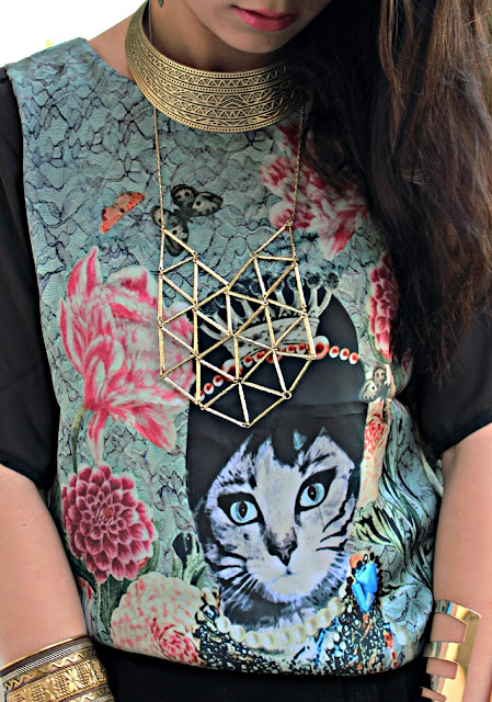 I’m about to go to bed, but I wanted to post this before I crashed out. I got this shirt from Romwe with a sort of queen kitty on it! It’s got this really funky all over the place feel with the cracked pattern and floral design. I paired this with tribal printed jewelry to add to the madness of all the patterns in the shirt. Went with my cut out theme again as you can see in the necklace, cuff, and shoes. Anyway, I really hope you guys enjoy this look but I need to sleep!!!