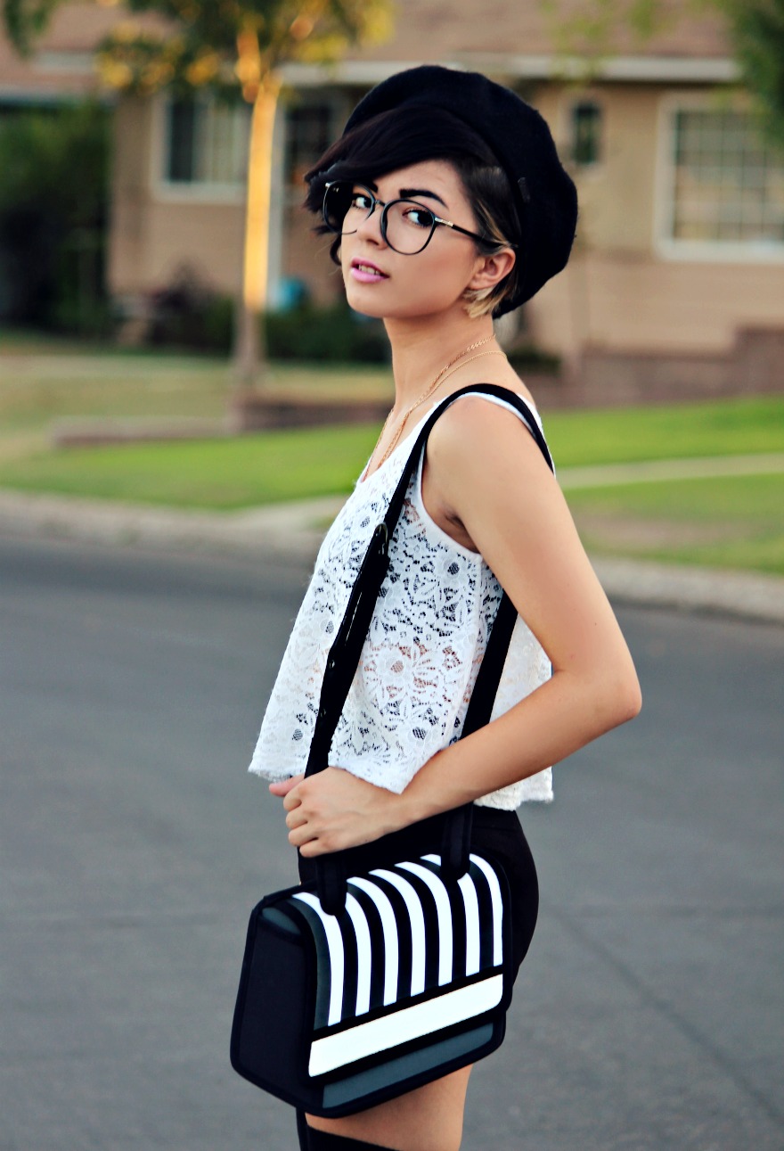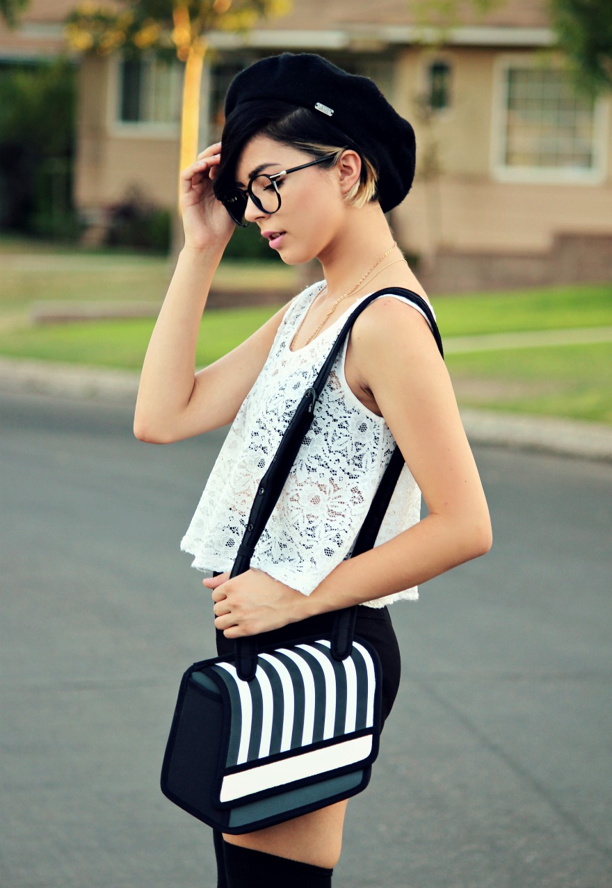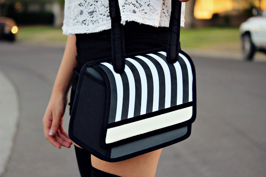 I got a new haircut, I felt like I really needed the change. Even though I love long hair I just felt like it was boring. It was also nice to cut off all of my fried ends from dying and bleaching my hair so much, a fresh start!!! So, I made this super cute girly black and white outfit based around the adorable bag I received from Jump From Paper. It’s such an awesome bag because it appears to be flat, but in fact is 3d. There is a panel in the bottom of the bag to create more room if it’s needed, it’s like a cool, creative, quirky little clutch! I love to have any interesting item to add to an outfit and I find that bags are a great way to do this. There are just so many cute and funny bags out nowadays that you can use to really add some kick to an otherwise boring outfit 🙂
