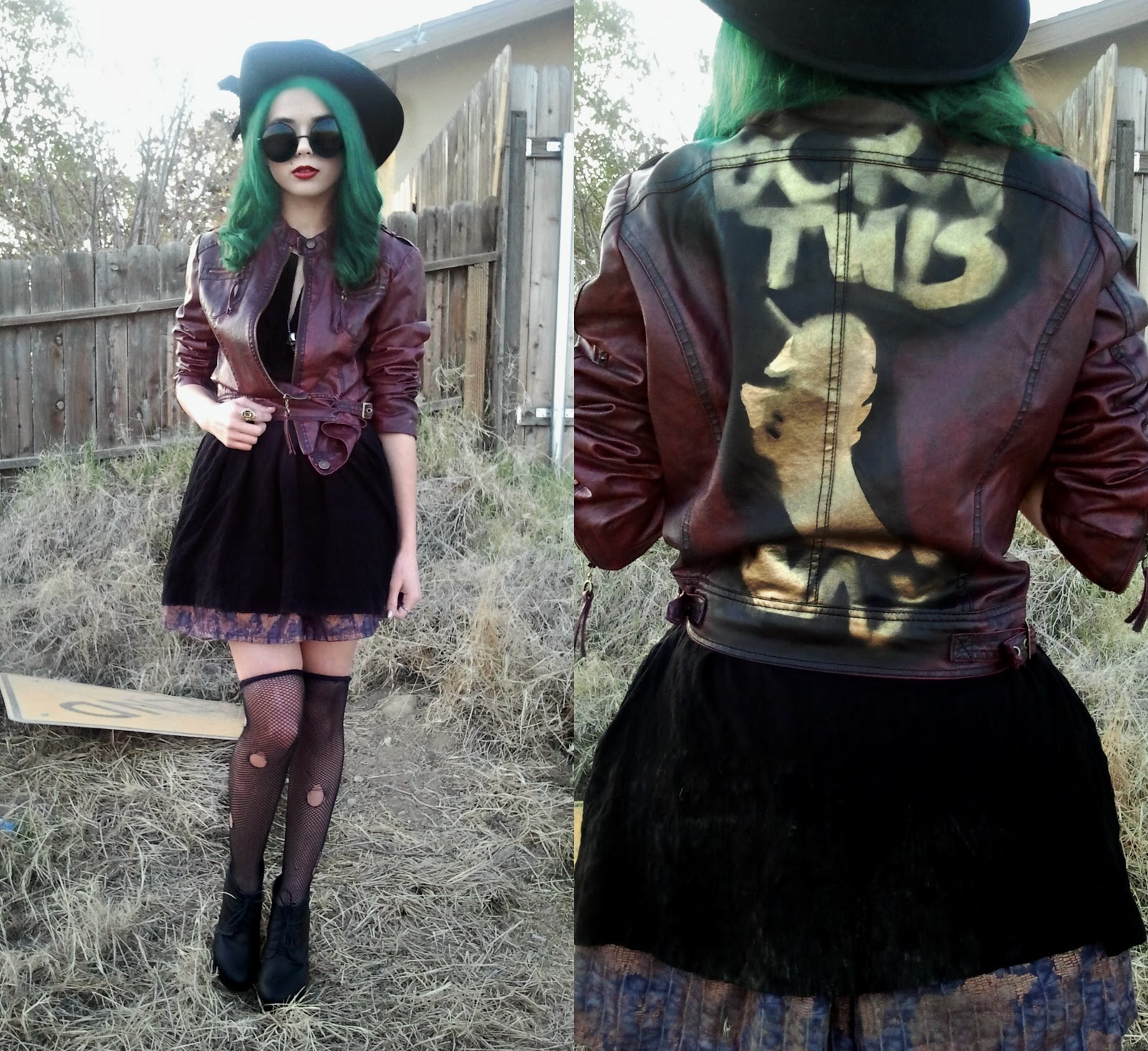 For this very Telephone GaGa inspired makeup look by Marla I put together this outfit to coincide with it! GaGa’s fabulous style cannot exactly be replicated but I took some of the basics from her style in music video, Telephone. At the beginning of Telephone GaGa is seen wearing super tall heels(Surprise, surprise!), fish nets, and lots of leather and black!!! What I am wearing are tall wedges I bought from Forever 21 along with the dress that I layered with petticoats to create the shape. DIY fish net socks, and a DIY Born This Way leather jacket! And some super cool shades and dark lipstick to pull the look all together!