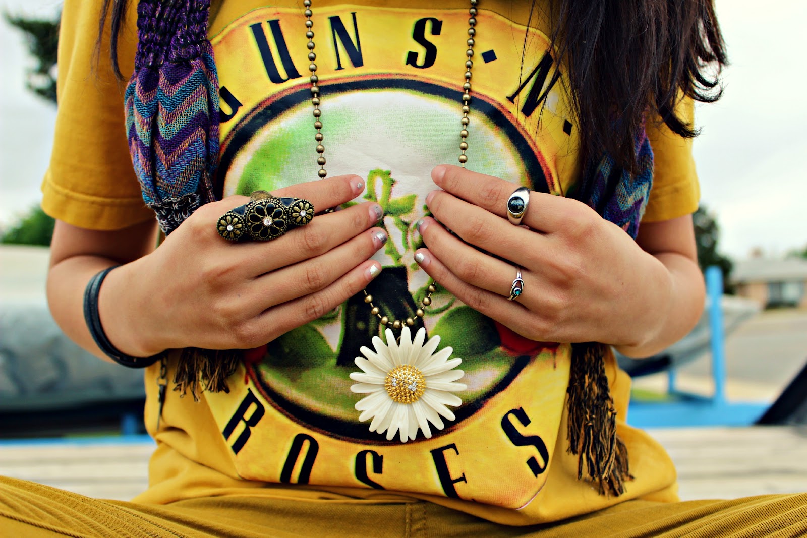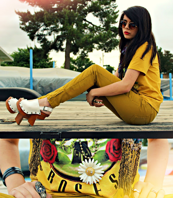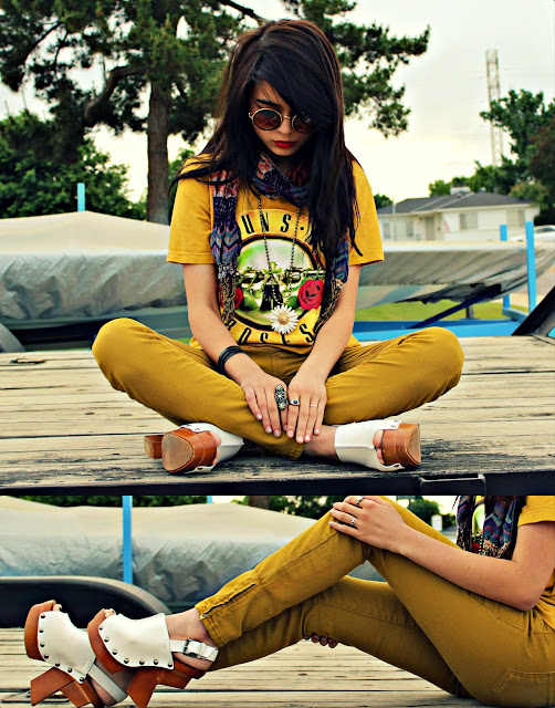 Yesterday was pretty gloomy, so I wanted to brighten it up with some yellow and flowers, and good ol’ rock n’ roll! I paired this mustard shirt together with my olive colored pants I got from Forever21 to create this nice color pallet. The touches of red was a needed touch to keep this outfit from looking too… barfy. Haha. My shoes I absolutely love! I feel like a geisha… yet Swedish because they’re just so cloggy! The shape is so interesting, definitely something NO ONE in my town has ever even been exposed to(I went to the mall this weekend and captured many peculiar looks, I was even stopped by one woman demanding she know where my shoes were from!)