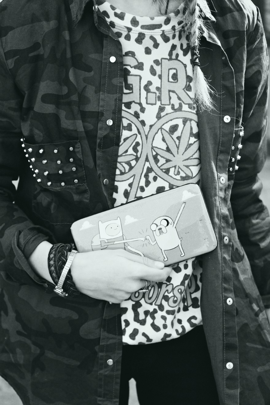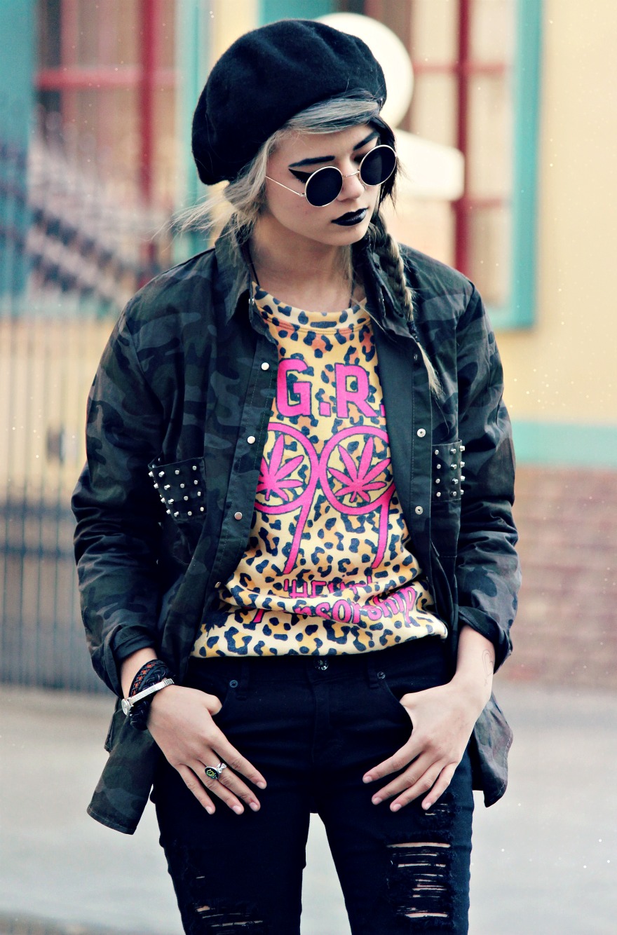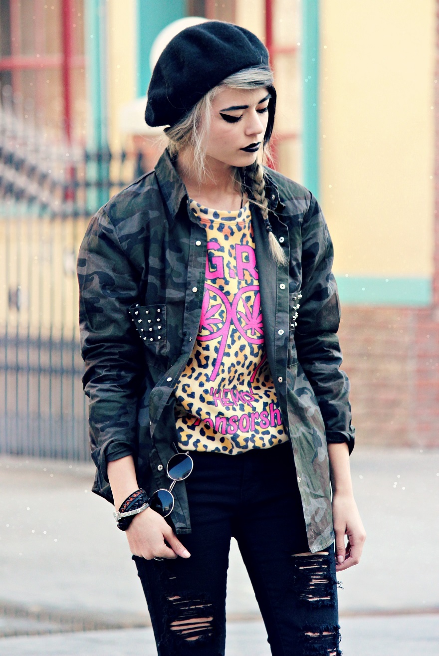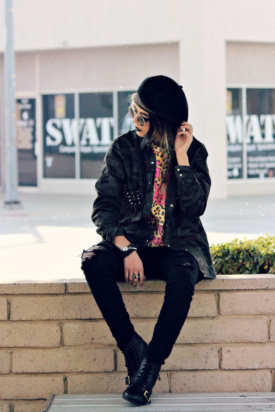 Pretty casual outfit today. Everyday, but mixing fun prints to make it more interesting! Not sure if leo print and army print are the best at harmonizing, but hey! Why not!? I wanted to give this outfit a little more of a cutesy look with this wool beret and with my tiny rat tail braid poking out the side. I actually got this beret from a VANS store in Chicago a months back on sale! It was only 3 dollars! I stopped by Hot Topic and picked up this super adorable A.T. wallet too while I was there. I swear, Hot Topic wallets are THE BEST. By the way, have any of you ever been to the Chicago mall? It’s so giant!!! And they have a reptile zoo in there. That was the most exciting part of the whole mall!