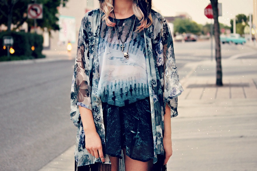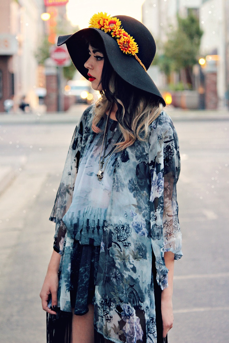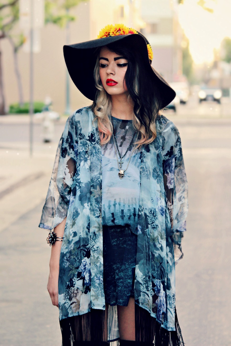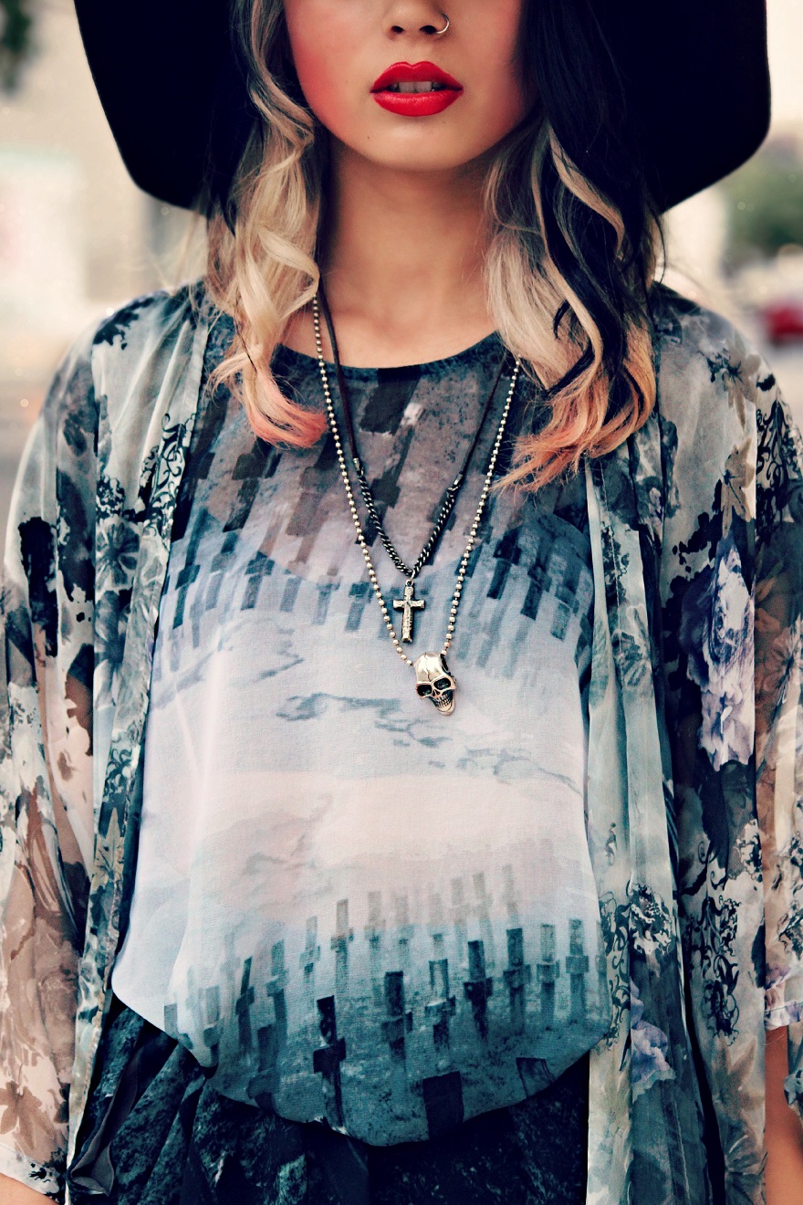 I happened to have a kimono shawl that had the same exact color scheme as the dress I’m wearing! I love how the floral print of the shawl contrasts yet harmonizes so well with the graveyard scene on my dress. Life and death really go hand in hand after all.