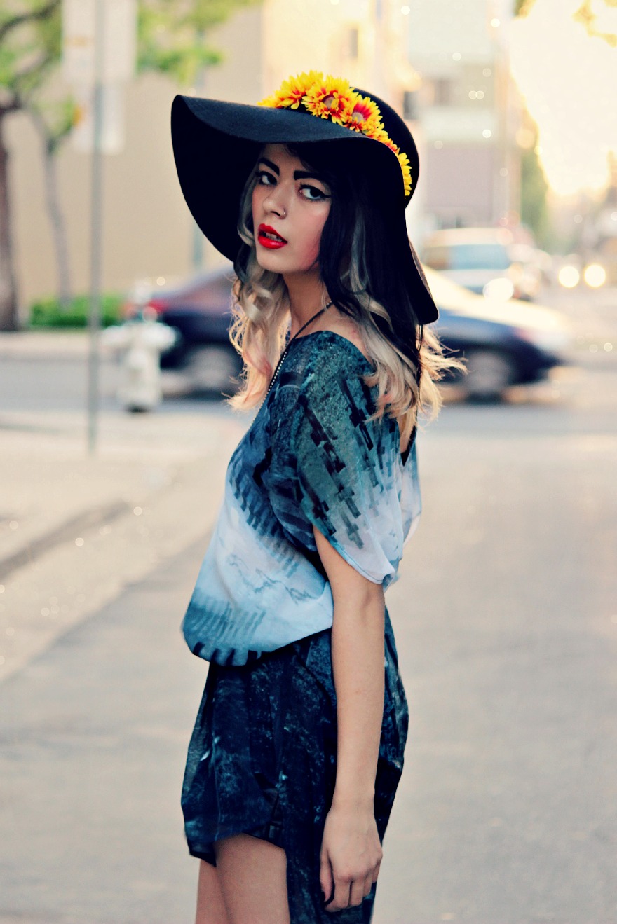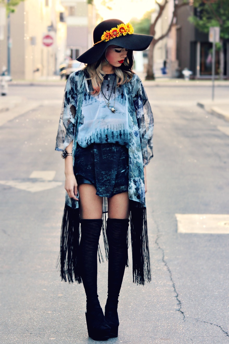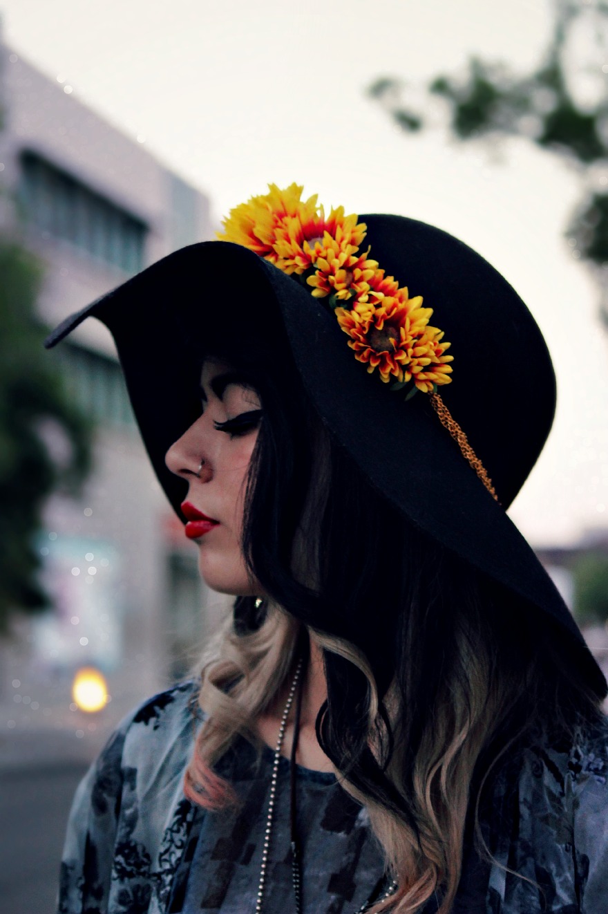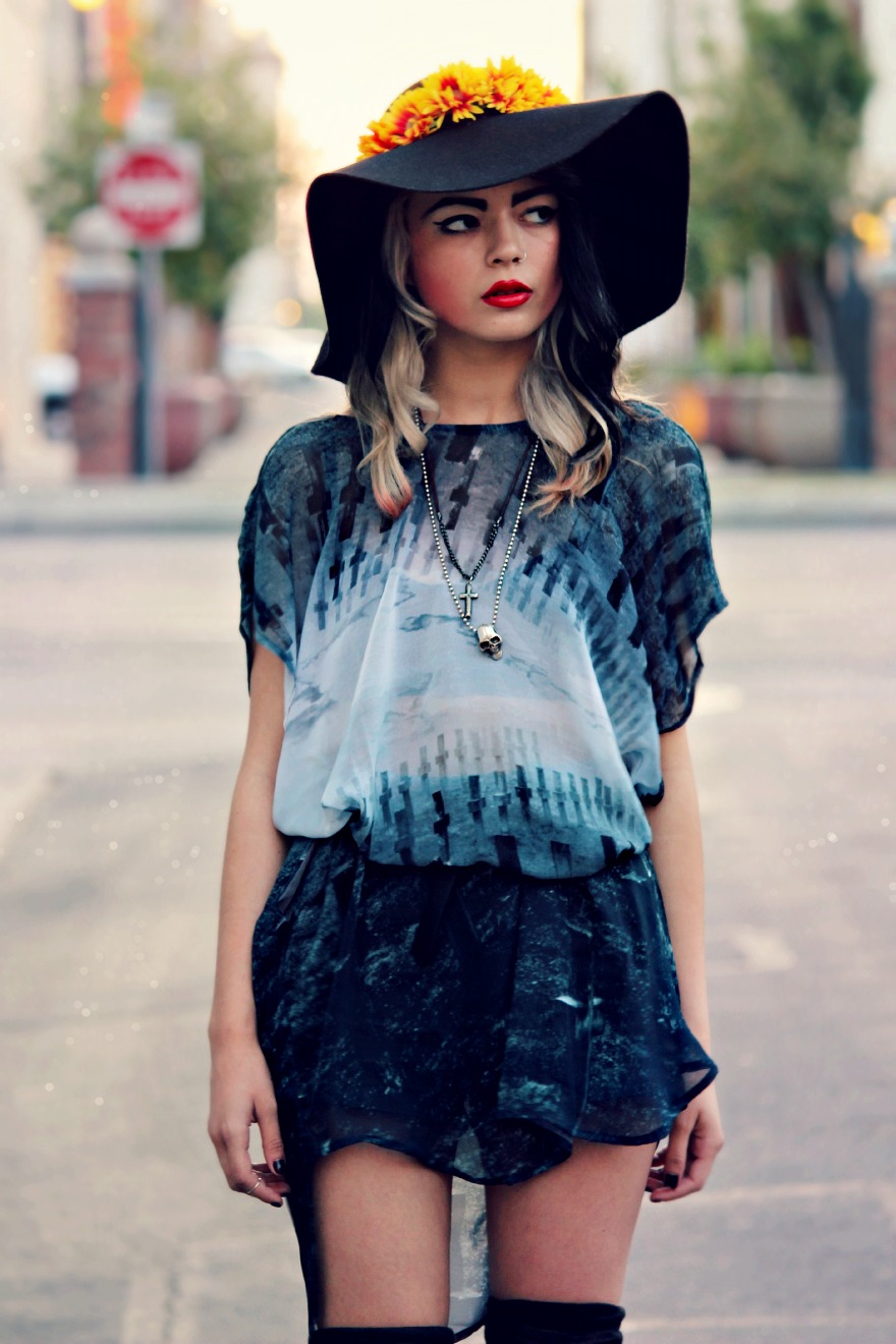 I happened to have a kimono shawl that had the same exact color scheme as the dress I’m wearing! I love how the floral print of the shawl contrasts yet harmonizes so well with the graveyard scene on my dress. Life and death really go hand in hand after all.