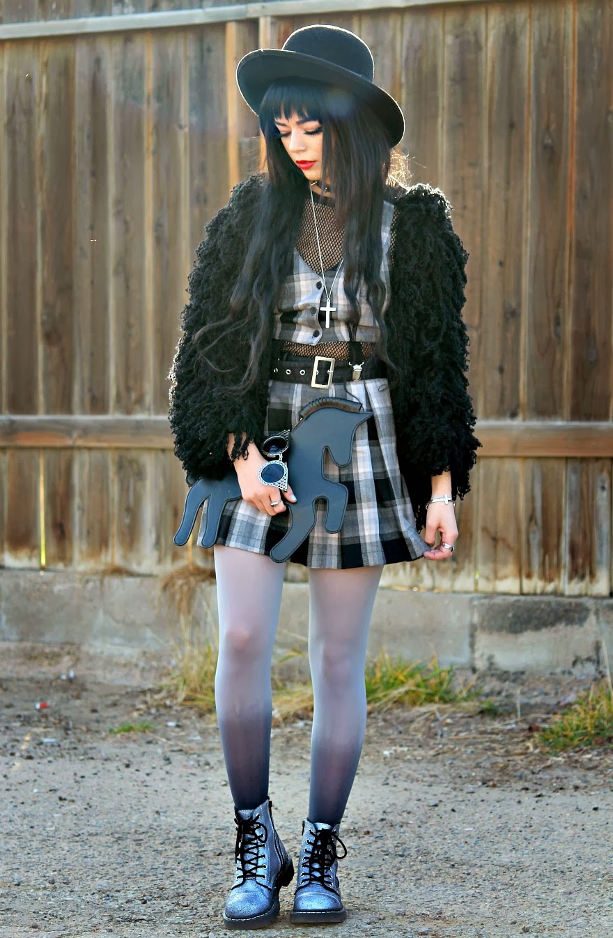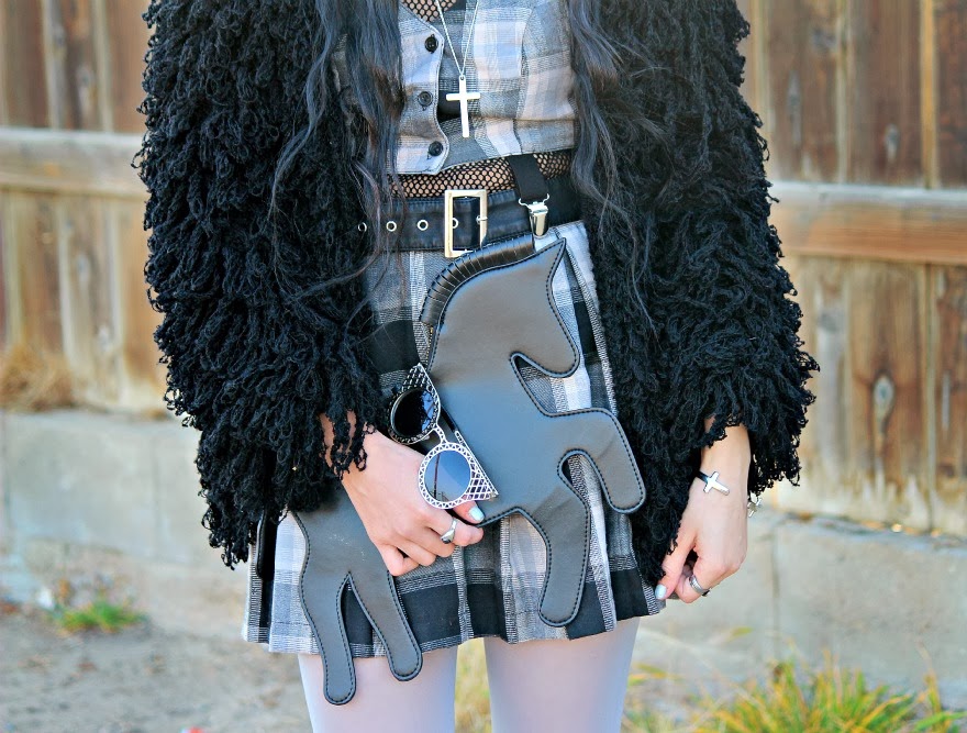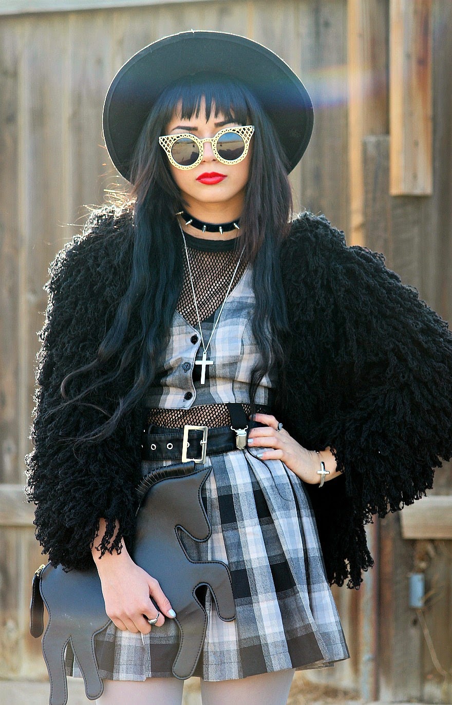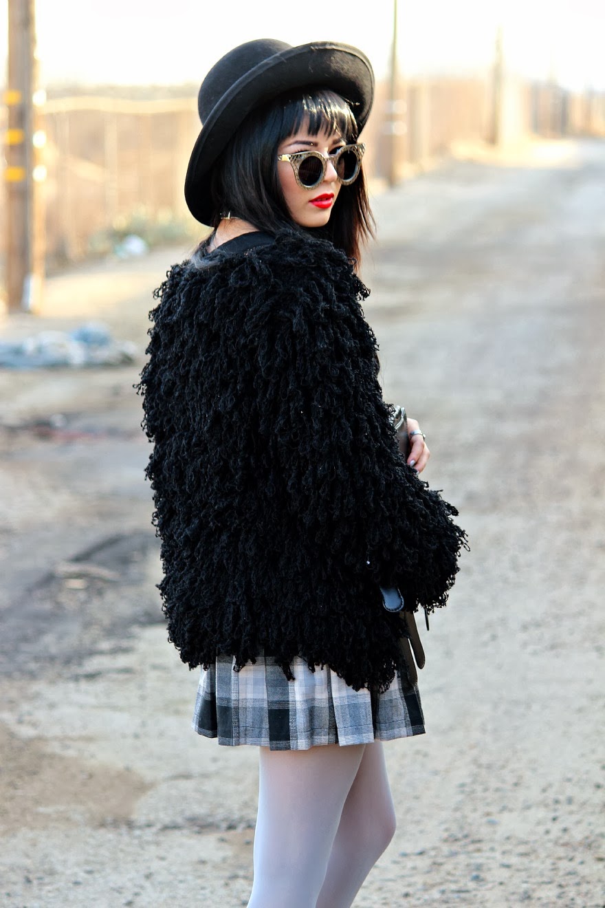 I have to say I am pretty satisfied with how this outfit came out! I’m not sure what ‘style’ it is, but I would say it definitely has a party vibe. There’s just something that screams FUN about outfits that feature big shag coats. I am so happy that they’re becoming popular again! I’ve been wanting to find some in candy colors, or a lime green would be perfect. I’m also pretty stoked on these new kicks T.U.K. sponsored me. They’re silver with black speckles throughout the coloring making them less high shine and a much more subtle eye catching metallic.