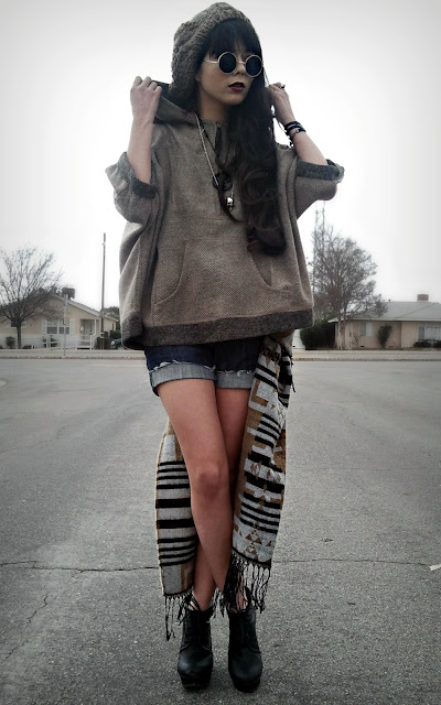 Sugarlips! It’s really big and comfy, something wonderful to snuggle in during those brisk days, it was great for today since there was a strong wind! 🙂 It has the cutest little fringe zipper at the neck too, and a lovely kangaroo pouch! I think this is a really great alternative to the average poncho a lot of kids have been wearing now a days, same feel but only goes to the elbow plus a zip feature! The color makes it really versatile with a lot of different clothing, it’s a great staple piece. Also, I suggest if you’re around a small-medium in shirts to get an X-Small like I am wearing because it is very forgiving in roominess 🙂