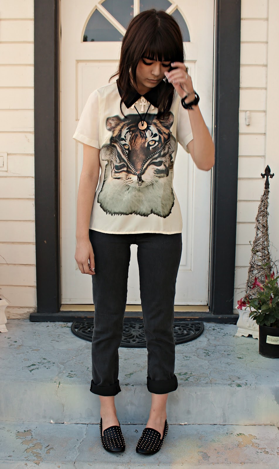 My top is from Solilor. They have tons of great and interesting printed tops, but I decided on this tiger popping out of a cat costume. The back is button-up, I should have taken a picture of that detailing but forgot in the haze of hunger for pizza 😛 I got the roll up pants and (ADORABLE) stud flats from F21 during their great buy one get one free sale this weekend.