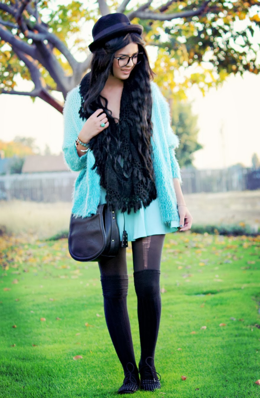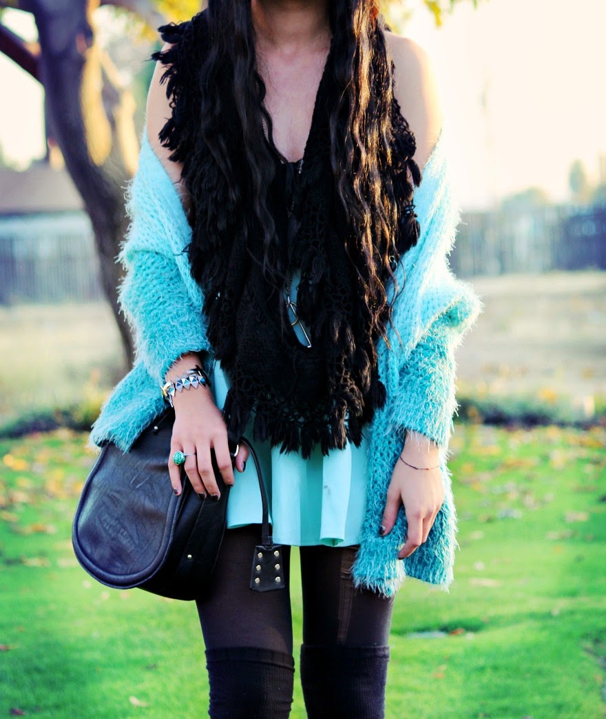 This is probably one of my favorite looks that I’ve done for a LONG time. Fall is an amazing season to experiment with layering. You should try layering with scarfs, outerwear, stockings, bags, jewelry, hats… everything! I’ve never worn so much aqua in one outfit, but I think that it looks pretty cute and stylish.